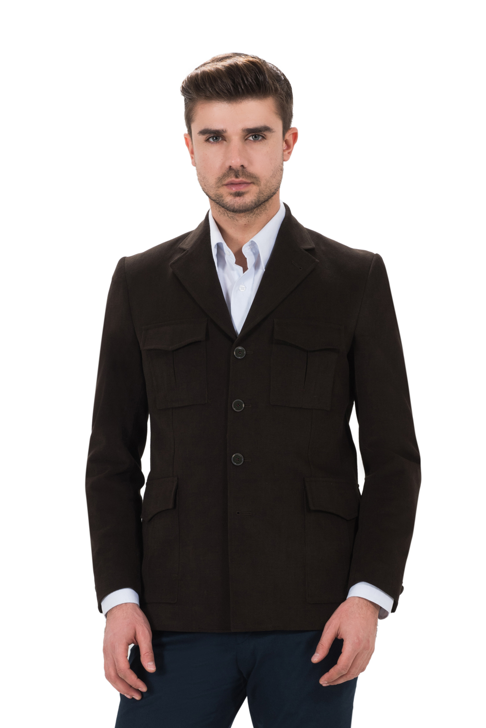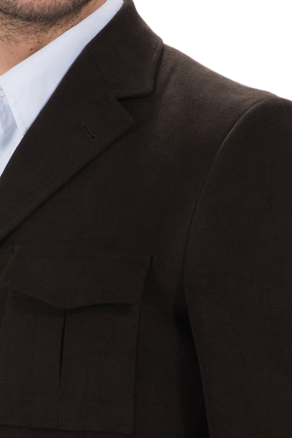 Jacheta scurta cu croiala normala, realizata din bumbac maro. Are captuseala matlasata si detalii contrast la interior. Manechinul poarta masura 48 si are 1.85 m inaltime. Compozitie: 100% bumbac