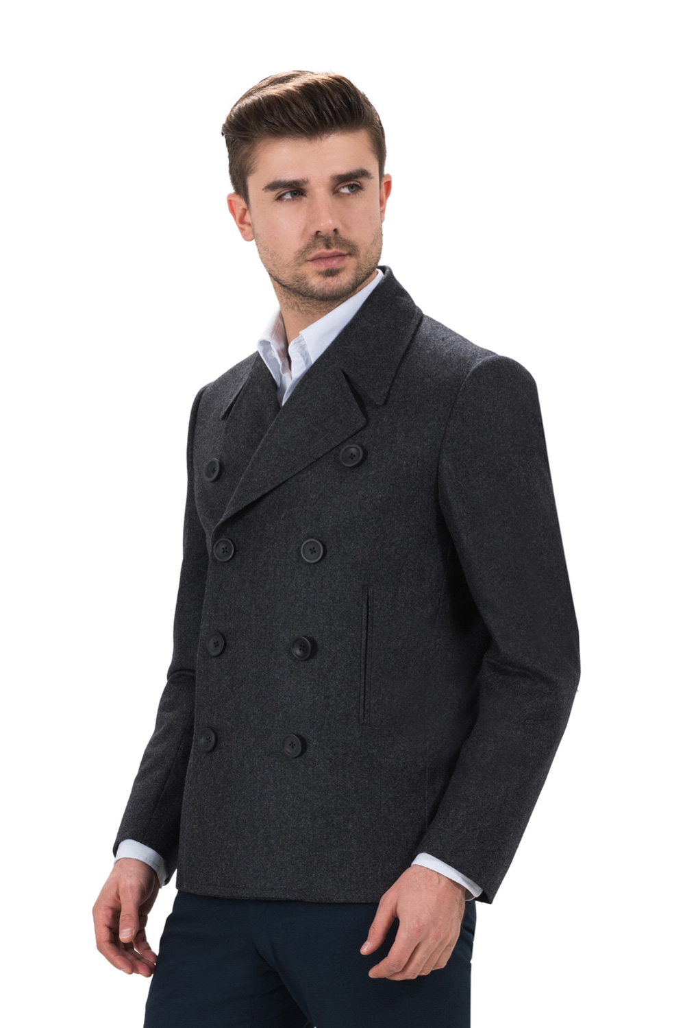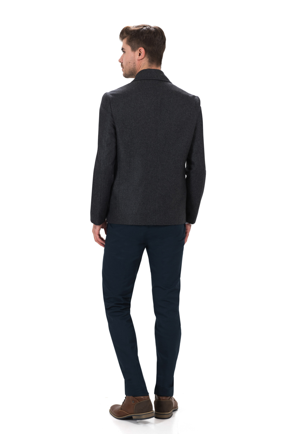 Jacheta cu croiala slim-fit realizata din tesatura din lana gri inchis. Compozitie: 100% lana. Manechinul poarta masura 48 si are 1.85 m inaltime.