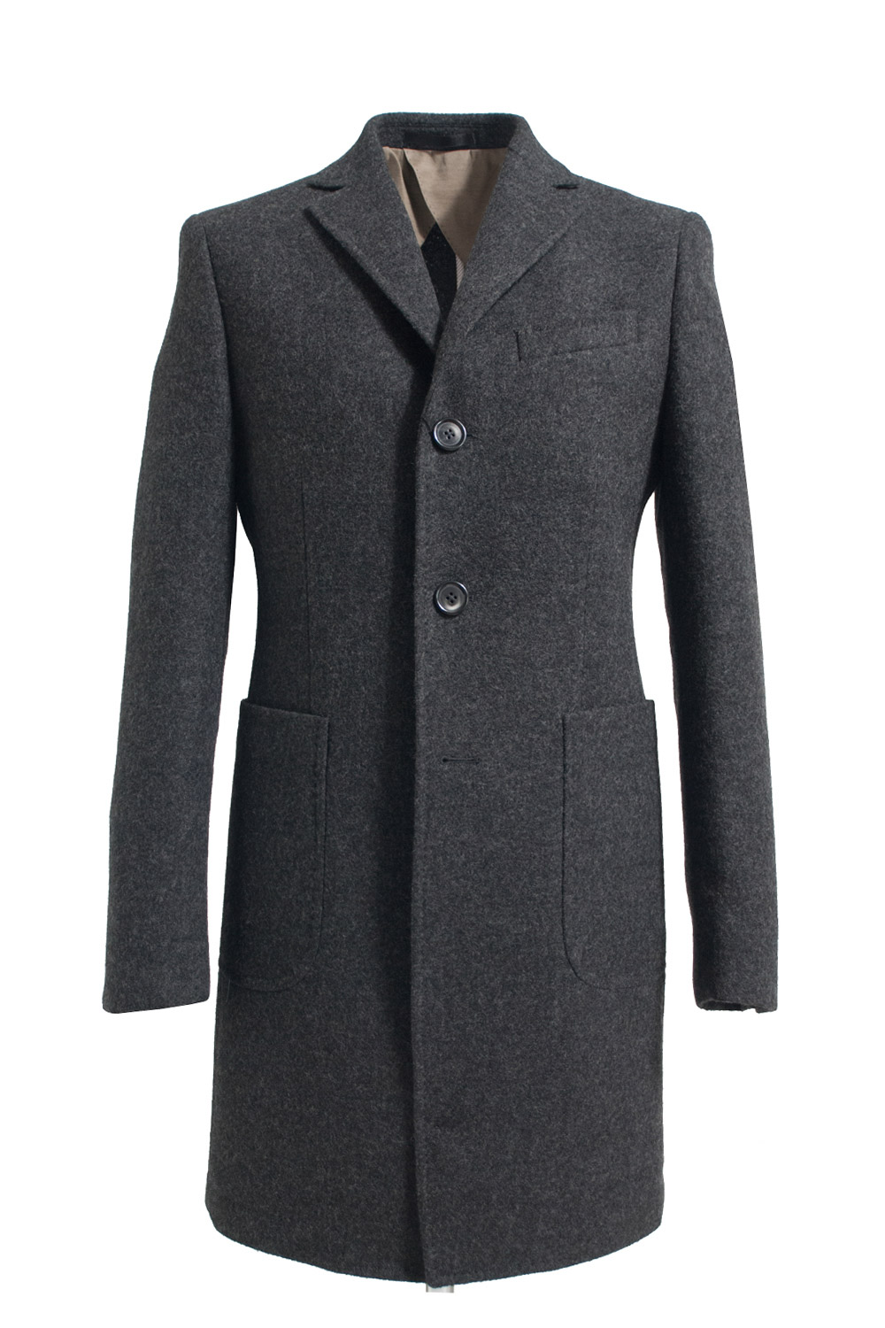 Pardesiu cu buzunare aplicate, cu detalii contrast, semicaptusit realizat din tesatura de lana gri. Compozitie: 100% lana