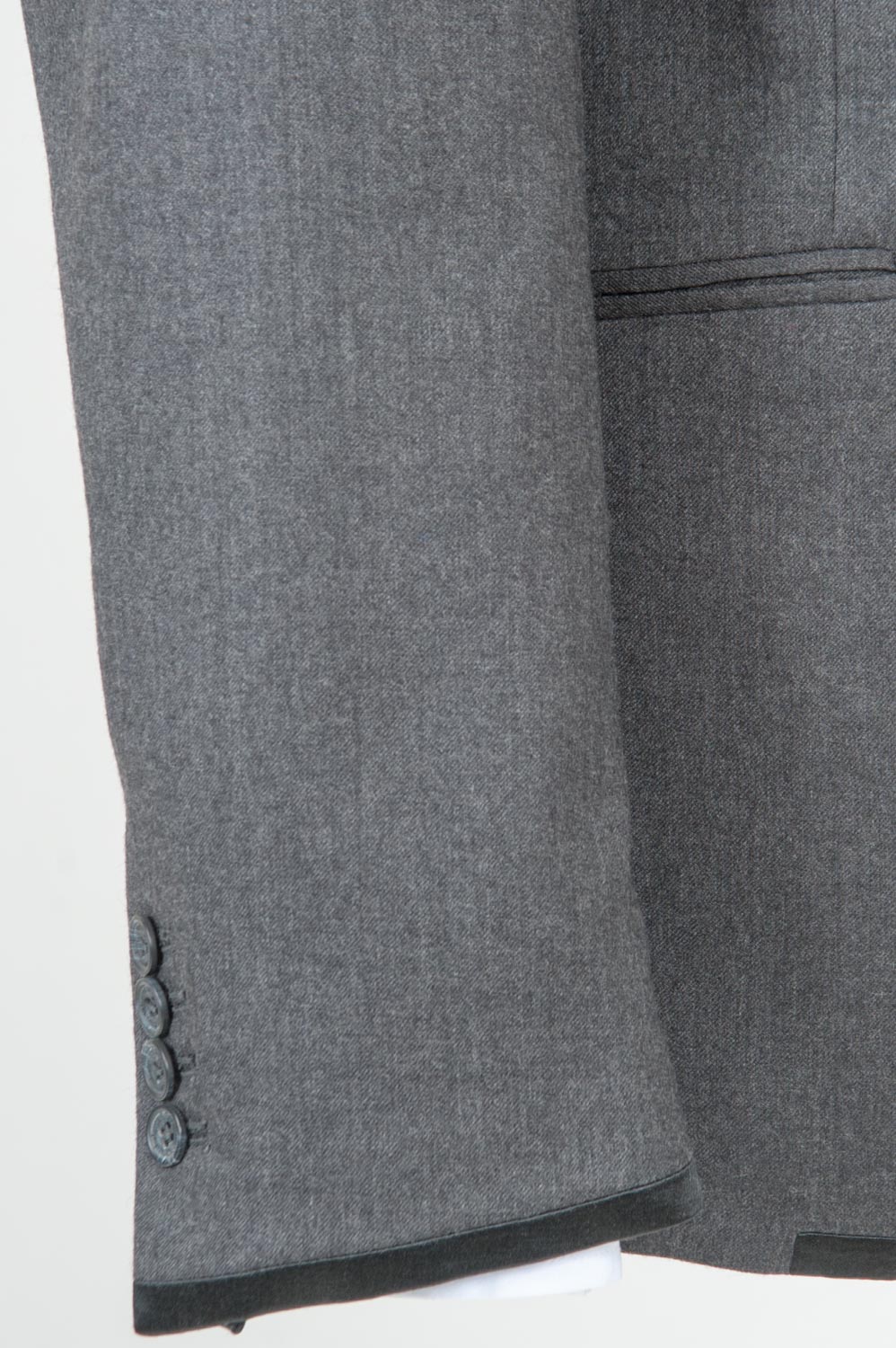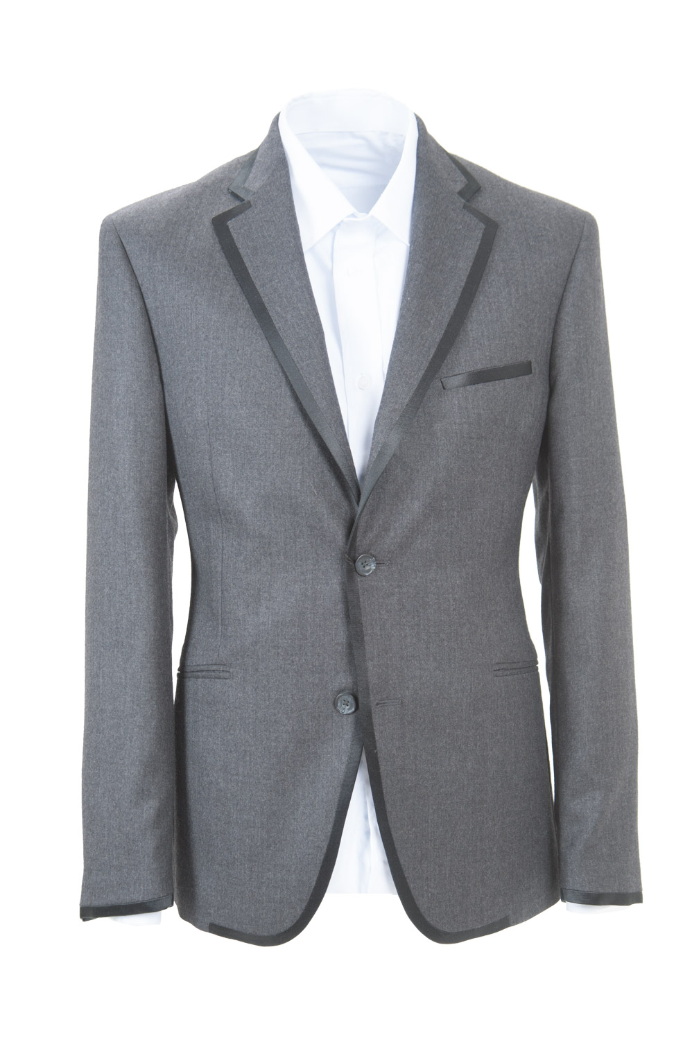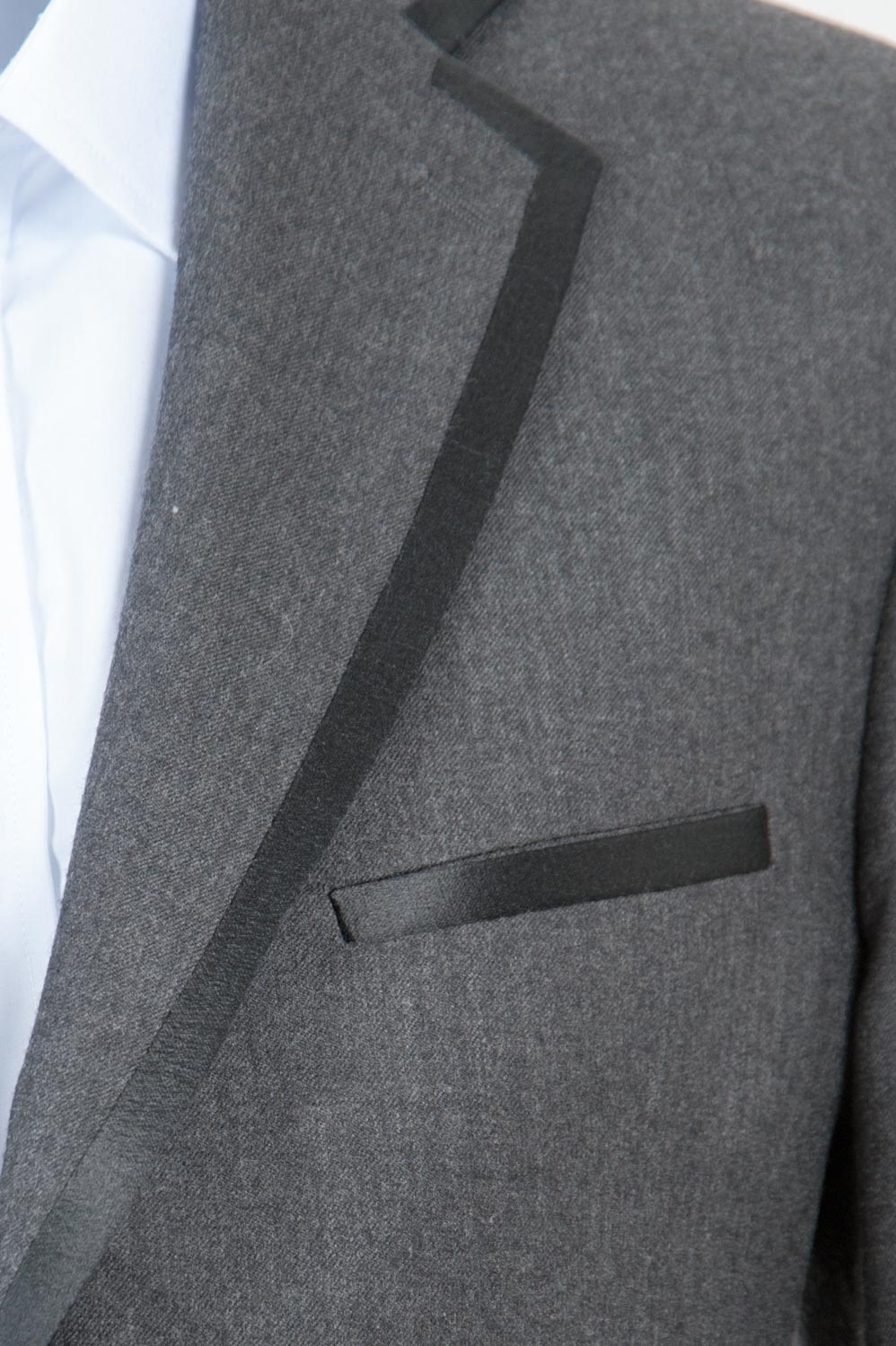 Sacou cu croiala normala realizat din flanela de lana gri cu detalii din satin negru. Compozitie: 100% lana