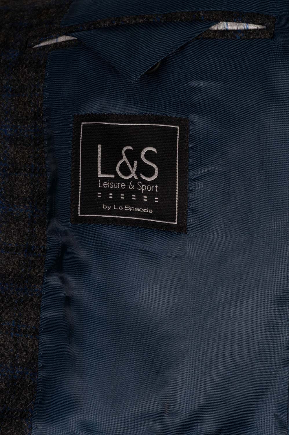 Sacou cu croiala clasica pe talia I, realizat din tweed de lana in carouri gri cu bleumarin. Compozitie: 100% lana