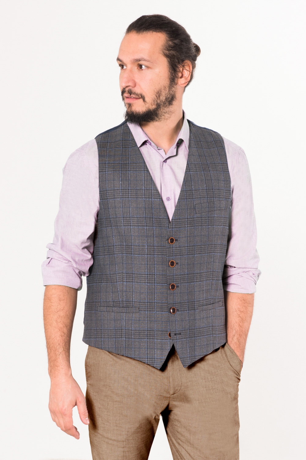 Vesta clasica cu 5 nasturi si croiala slim-fit realizata din tesatura de lana gri cu carouri. Compozitie: 100% lana